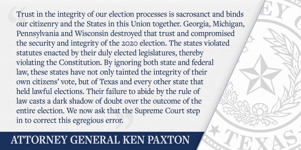 En su denuncia ante la Corte Suprema de Estados Unidos, Paxton señala que “la confianza en la integridad de nuestros procesos electorales es sacrosanta y une a nuestra ciudadanía y a los Estados juntos. Georgia, Michigan, Pensilvania y Wisconsin destruyeron esa confianza y comprometieron la seguridad e integridad de las elecciones de 2020. Los estados violaron los estatutos promulgados por sus legislaturas debidamente electas, violando así la Constitución. Al ignorar las leyes estatales y federales, estos estados no sólo han manchado la integridad del voto de sus propios ciudadanos, sino de Texas y de todos los demás estados que celebraron elecciones legales. Su falta de acatar la ley arroja una sombra oscura de duda sobre el resultado de toda la elección. Ahora pedimos que la Corte Suprema intervenga para corregir este terrible error”.