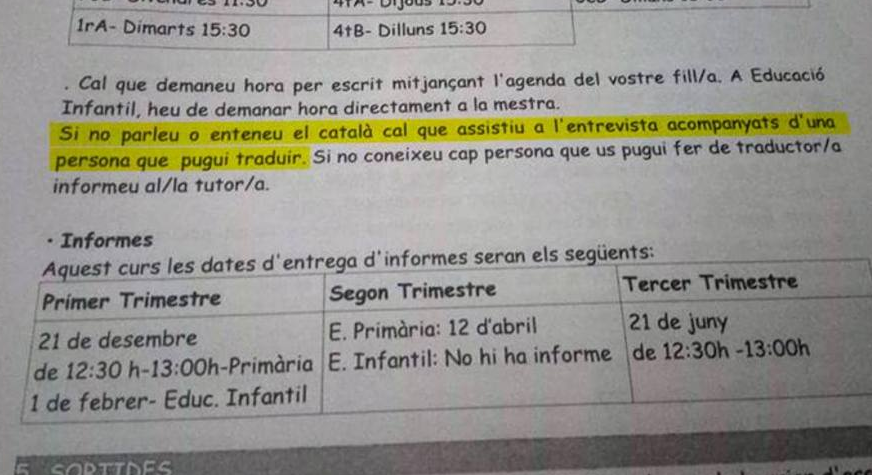 La Asamblea por una Escuela Bilingüe de Cataluña (AEB) ha compartido a través de Twitter la guía que el centro CEIP Marià Fortuny de Reus (Tarragona) repartió a los padres con motivo del curso escolar 2017-18, que se repite en el 2018-19. En ella, la escuela señala que las reuniones con los profesores para conocer la evolución del alumno “son fundamentales”. Pero después advierte a los padres: “Si no habláis o entendéis el catalán hace falta que asistáis a la entrevista acompañados de una persona que pueda traducir. Si ello no fuera posible, hay que informar al tutor”.